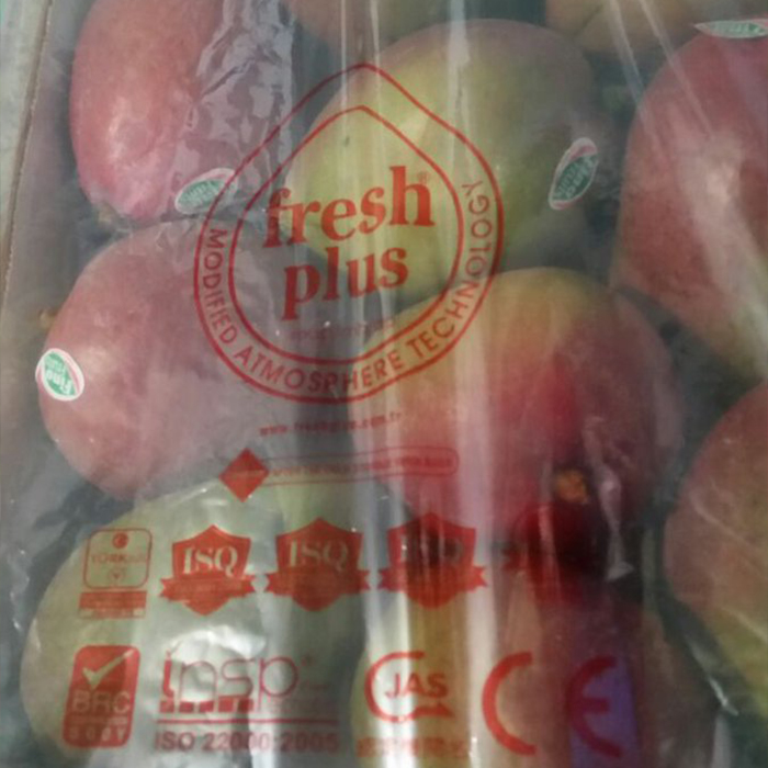 After harvesting, selecting, processing and pre-cooling mango, when the temperature of seed decrease desired level in our bags sealed, with the help of rubber band and our MA/MH applications starts. Environment in accordance with the appropriate without ethylene our bag provides a combination of CO2 and O2. Our bag does not create a layer of mist which prevents the purchaser to see the products. It eliminates decays caused by moisture and mold. Thanks to inside the bag created relative humidity protection the color, flavor, chilling injury and freshness of mango, at the same time substantially prevents dots and loss of water. For this reason it prevents deliquesce of the product and therefore reduces wastage.